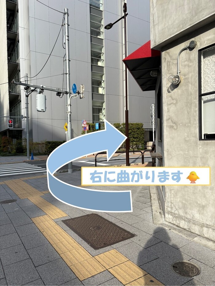 ⑥信号手前を右に曲がる 信号を渡らず、コンクリート造りのビルを目印に 右にカーブするように曲がります。