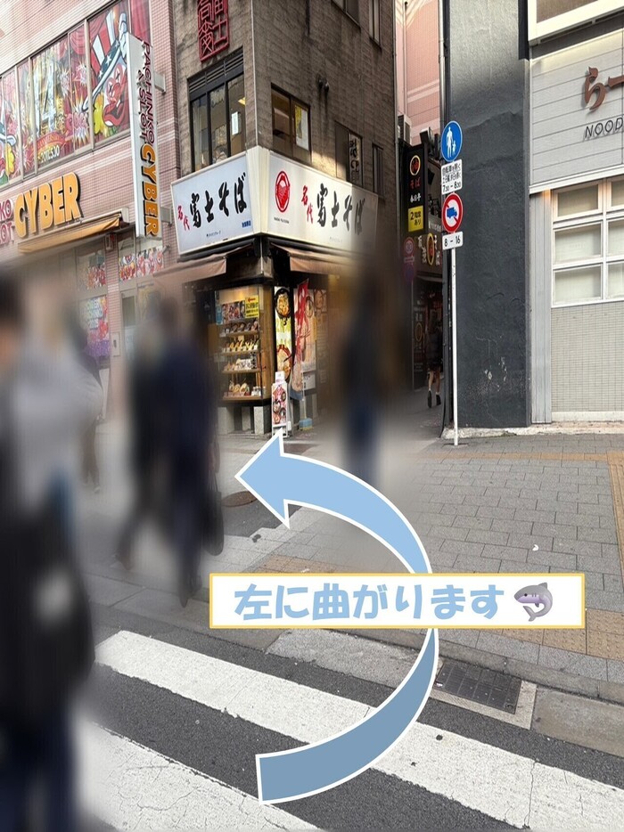 ④渡り終えたら左へ 横断歩道を渡りきると 蕎麦屋さんとラーメン屋さん が目印(2025年11月現在)。 ここを左に進みます。