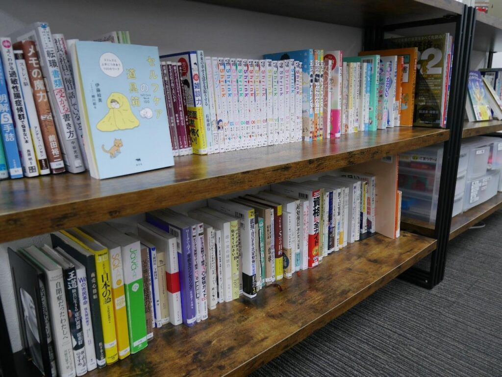オフィス内には、発達障害に関する本やストレス対処に関する本、MOSなどの資格関連書籍がそろっています。気になる本をその場で読んだり、貸し出しを利用したりすることも可能です。