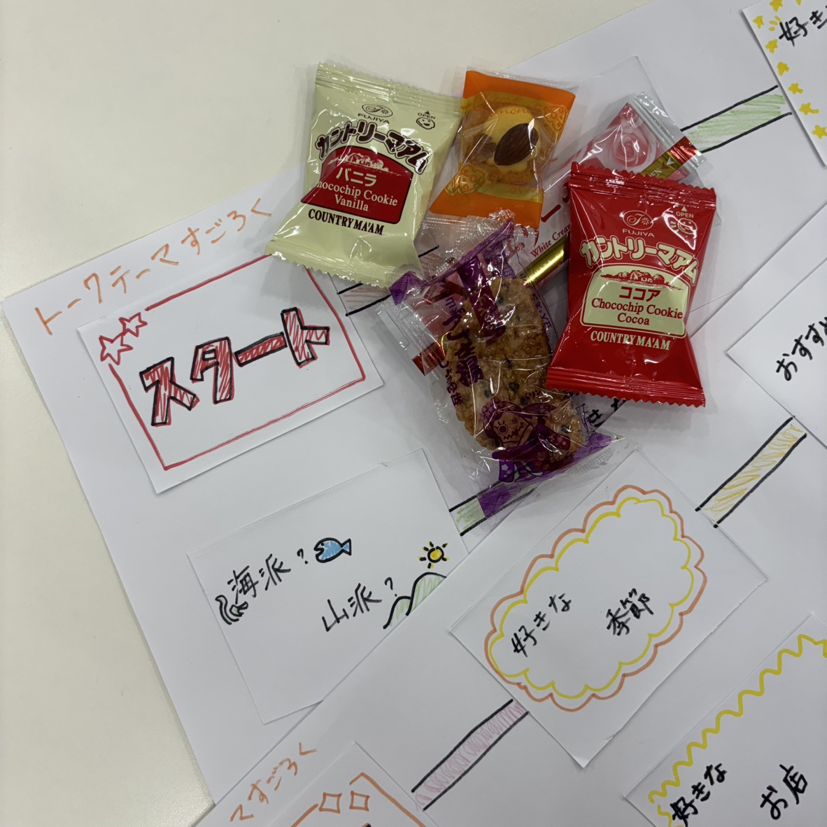 こちらのゲームは、サイコロを転がして出た目の数だけ進みながら、止まったマスに書いてあるテーマについてお話します。