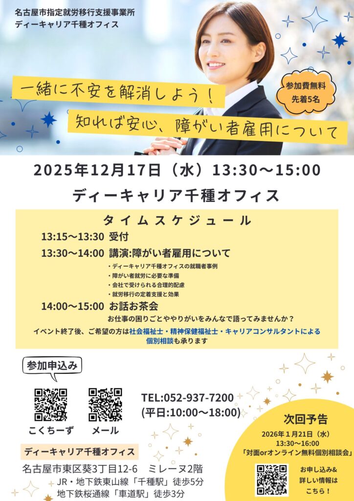 【イベントのお知らせ】一緒に不安を解消しよう!知れば安心、障がい者雇用について【ディーキャリア千種オフィス】