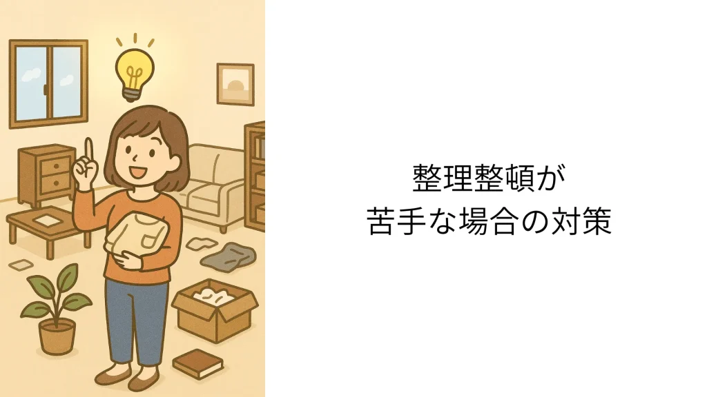 対策としては、物の置き場を固定する、ラベルを貼る、片づけのルールを明確にするなど、視覚的にわかりやすい仕組みを作ることが有効です。