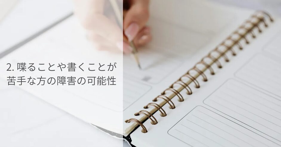 言語障害は言葉を理解したり、表現したりする際に困難が生じることが多い状態を指します。これらはコミュニケーションを中心に社会生活や職場での困難が生じます。特徴としては口頭での聞き取りが難しい、複雑な説明を理解するのに時間がかかるなどがあります。