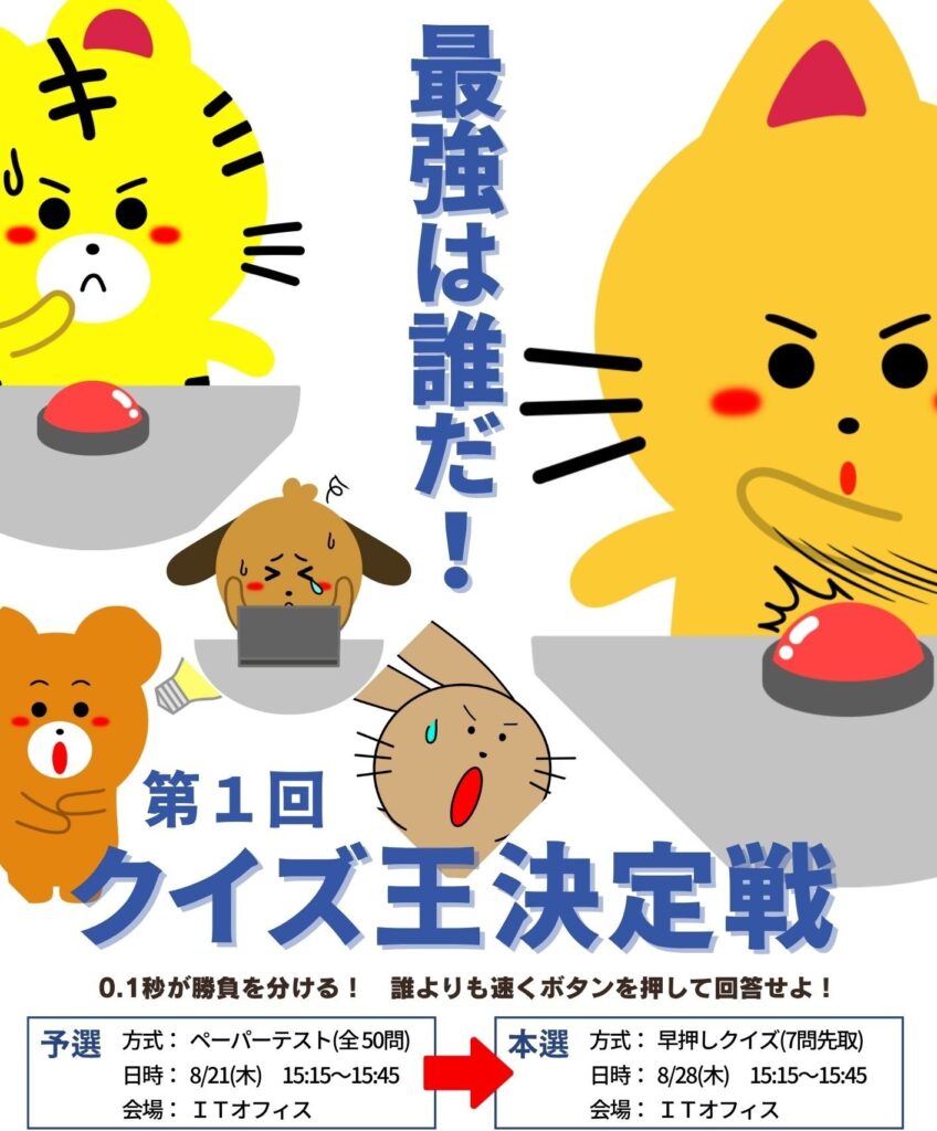 そこで、「誰が一番クイズが強いのか決めよう」という目的でガチの競技クイズとして、「第1回クイズ王決定戦」を今回実施しました!