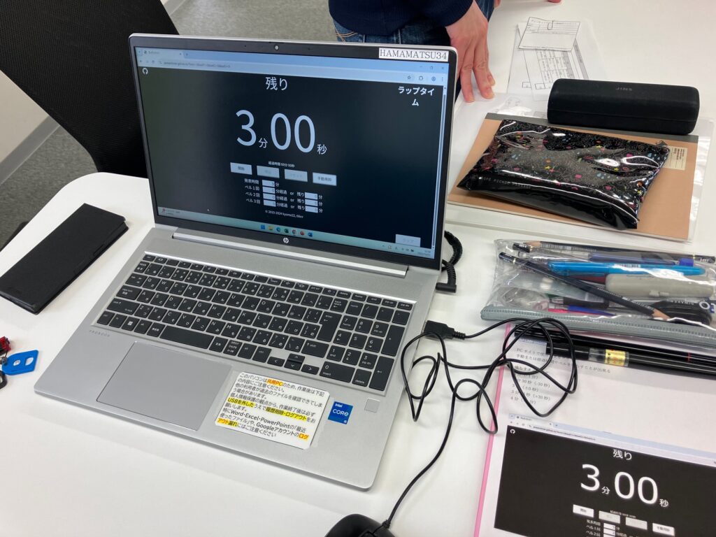 タイマーと時間経過のベルを合わせて計測します。時間内にスピーチを終えることができるかも加点要素の一つです。