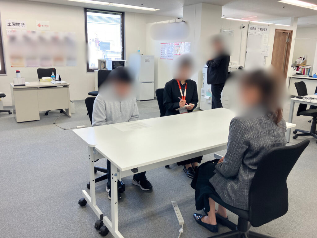 A社様が企業側役、本オフィス卒業生のC様が利用者役、スタッフMが同行スタッフ役で