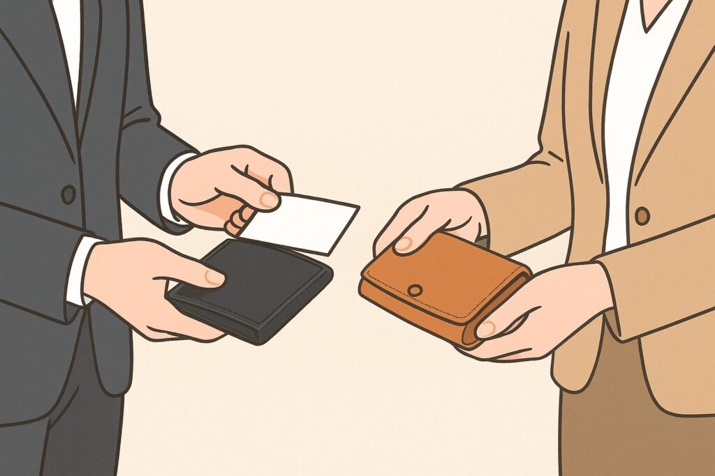 名刺交換の場面では、会話の前に相手の名刺入れが目に入ることがあります。