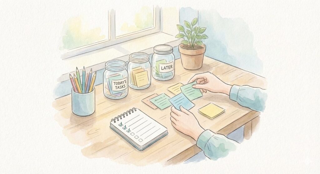 「脳のメモ帳」ではなく「紙のメモ帳」に情報を移すことで、脳の容量を空けることができます。「書いたから忘れても大丈夫」という安心感が、焦りを鎮めます。