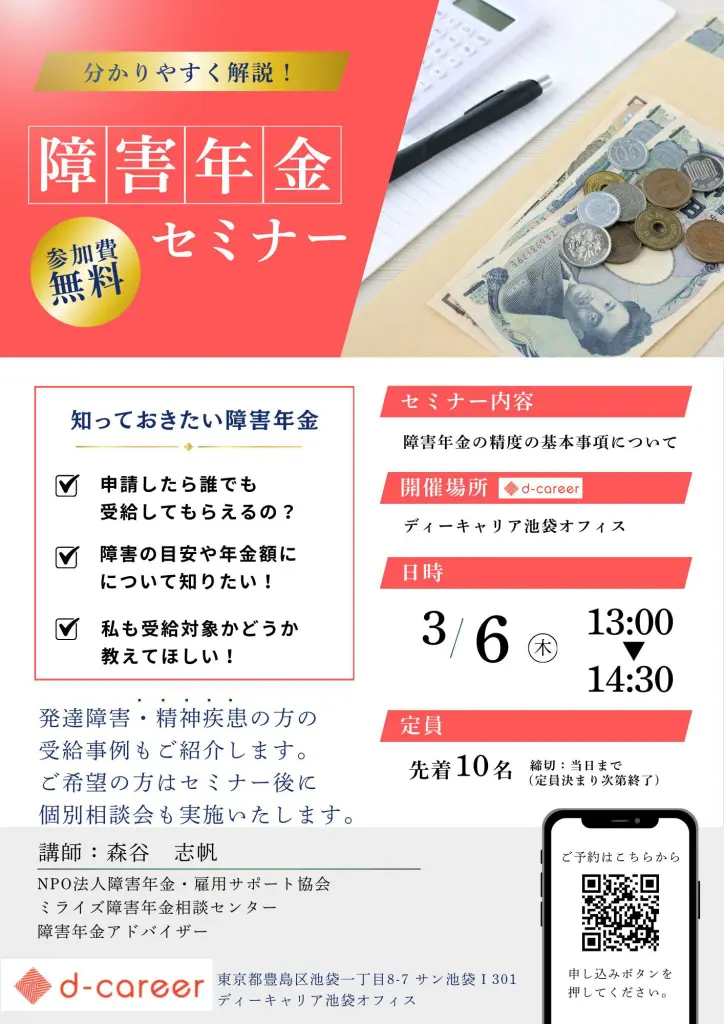 このような疑問をお持ちの方に向けて、障害年金の基本的な仕組みや受給要件についてわかりやすく解説します。セミナー後には、希望者を対象に個別相談会も実施いたしますので、ご自身の状況に応じたアドバイスを受けることができます。