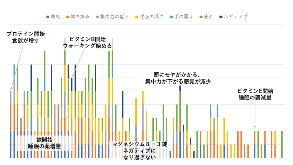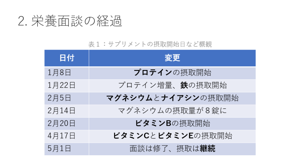 さらに、栄養素の補給として、プロテインやビタミン類、マグネシウムなどのサプリメントも適切に取り入れました。