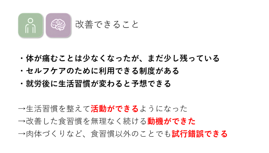 現在はほとんどの不調が改善されていますが、体の痛みなど、一部にはまだ課題が残っています。それでも、利用者さんは次のような前向きな姿勢を見せています。