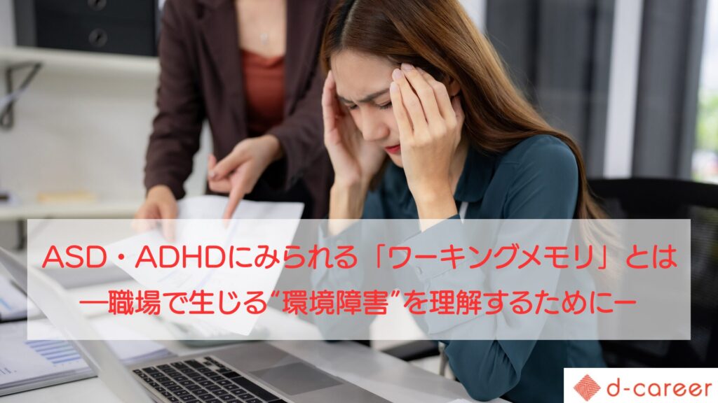 今回は、ASD・ADHDにみられるワーキングメモリの特性と、それが職場で引き起こす“環境障害”について紹介しました。