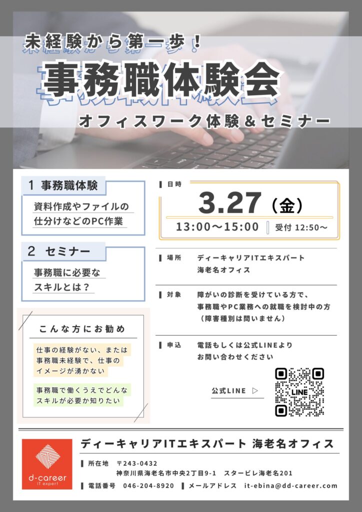 3月27日(金)13:00~事務職の業務体験イベントを実施します。