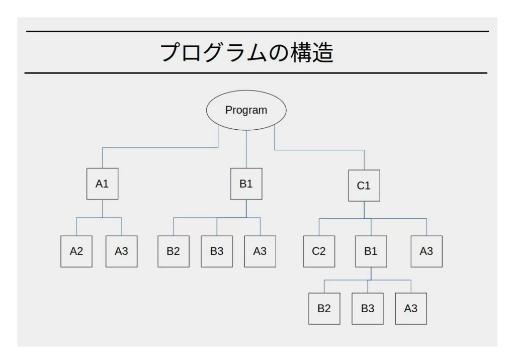 ② ある一部の命令をまとまりととらえて一つにし、プログラムはその命令のまとまりの集合だと考えます。