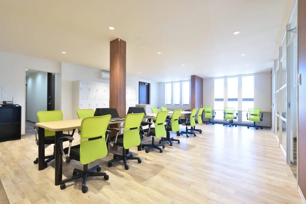フロア内は中央にテーブル席、個別用のボックス席、また大きなディスプレイがある会議室などがあります。そのほかに相談室などもご用意しています。