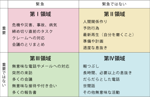 「緊急だけど重要じゃないこと」は、シンプルに廃止するか、どうしても誰かがやらなければならないのであれば、ルーティン化、仕組化、テンプレ化してしまい、そこにエネルギーを極力かけていかないようにしてゆくことが対策としては王道です。