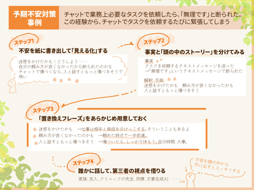 - 「思考のクセ」を紙に書き出す、事実と解釈を分ける、言い換えフレーズを用意するなど、認知行動療法に近い工夫が不安の軽減に役立つ