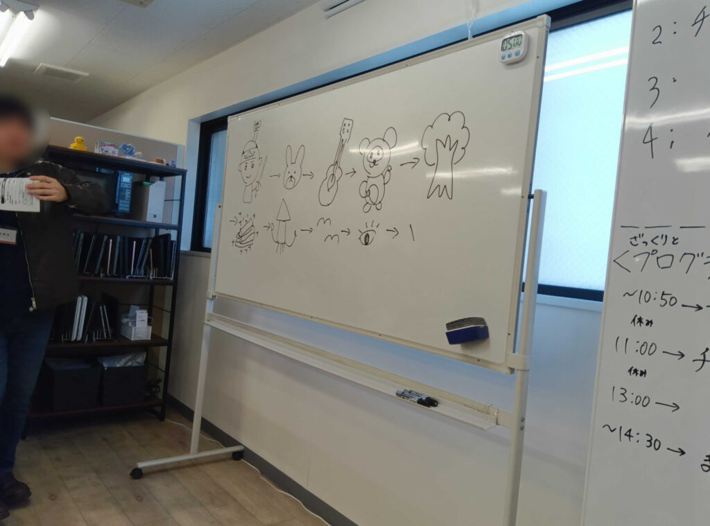 お題をもとに、ホワイトボードに絵を描いてしりとりを繋げていくゲームです。