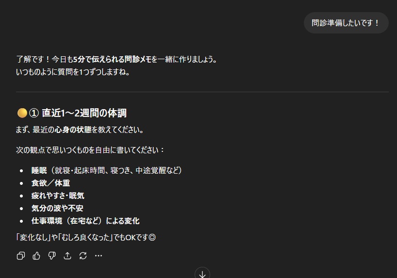 クリニックの問診前準備で、私はこう使っています(↓実際に私がChatGPTに打ち込んだ画面です)。