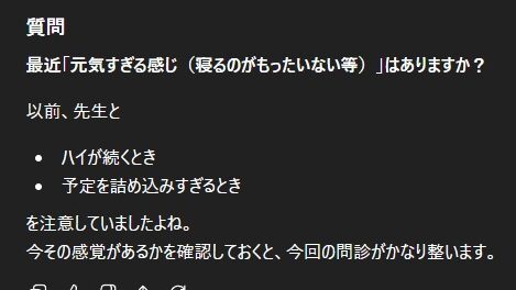 この質問に返すとより深い内省に繋がりますし、「時間ないんで、問診いってきます!」と質問を中断してもOKです。
