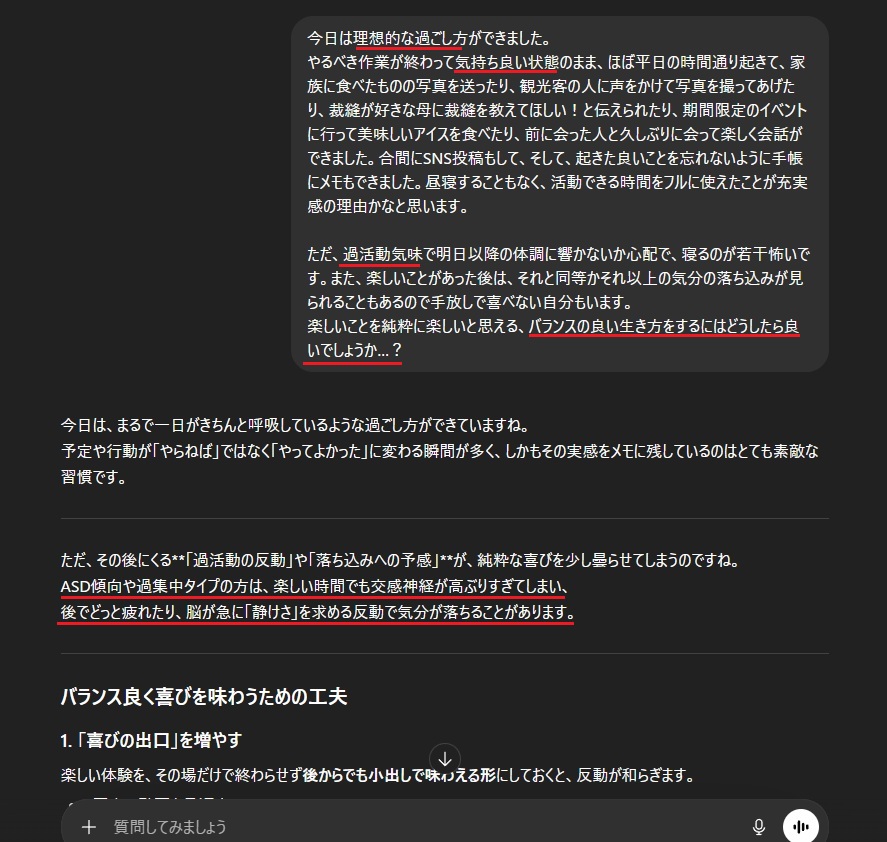 - ストレスへの対処方法(「喜びの出口を増やす」=後から見返せる写真や動画を残す、日記にして後日見返す、他の人に話す ことをAIから提案してもらいました)