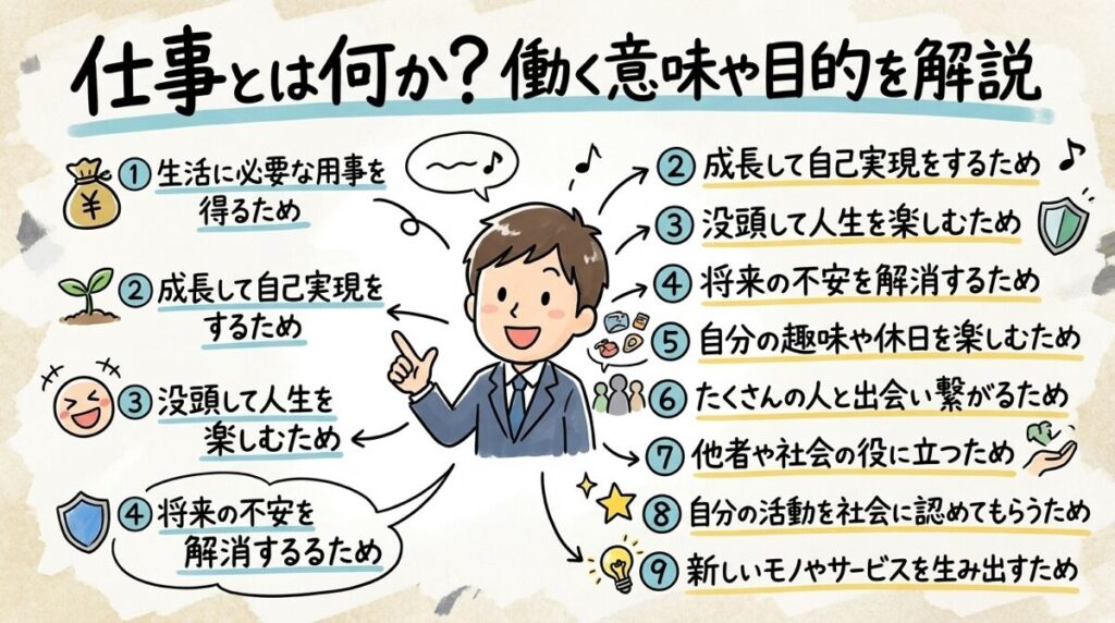 このイラストが示す通り、仕事には、私たち自身の人生を豊かにする9つもの意味や目的があります。