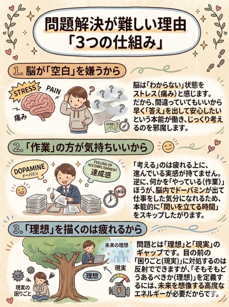 - 起こる弊害: 本来必要な「問いを立てる時間」をスキップして、慣れたルーチンワークに逃げてしまう。