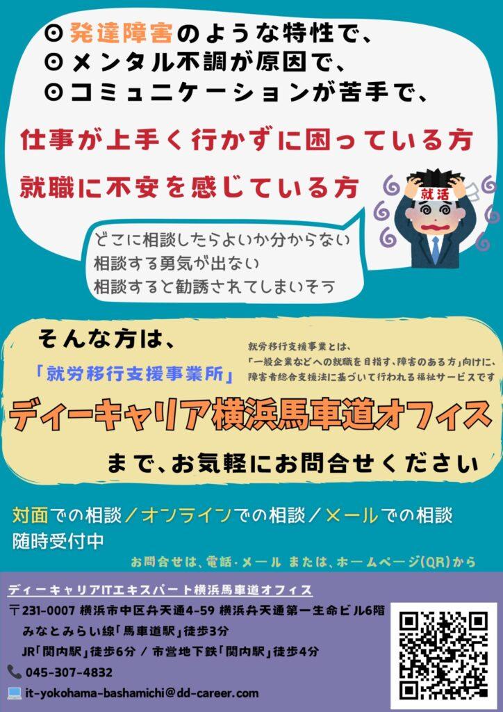 私たちディーキャリアITエキスパート馬車道オフィスでは、就労を目指す発達障害や精神障害のある方へ就職に必要な知識やスキルを提供しています。体験や相談も随時受け付けておりますのでいつでもご連絡ください!