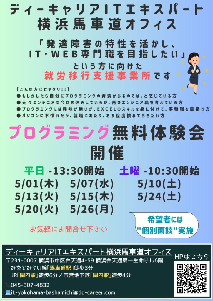 (ディーキャリアITエキスパート横浜馬車道オフィス|発達障害のある方の「働く」をサポートする就労移行支援事業所)