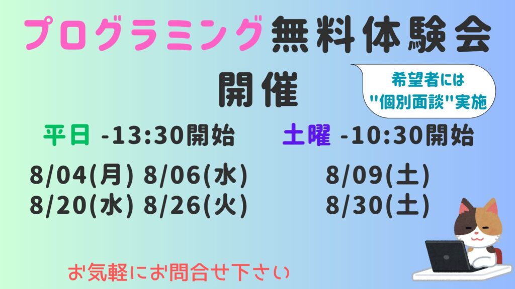 ▶相談会/プログラミング体験会、随時受付中です。