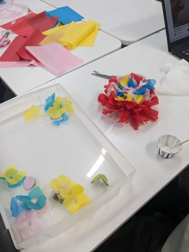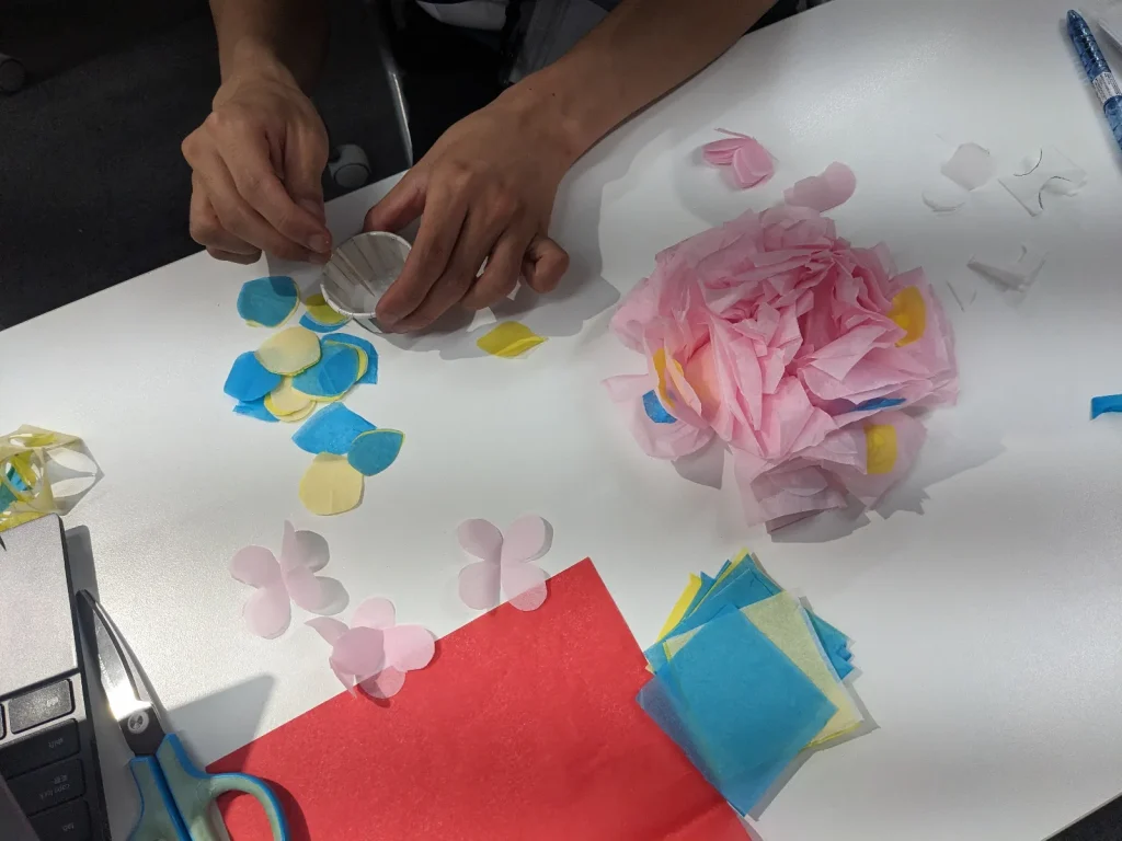 小さい花を作るのは難しいという方も、丸く切った紙を貼ってオリジナルな花の作成をしていました。