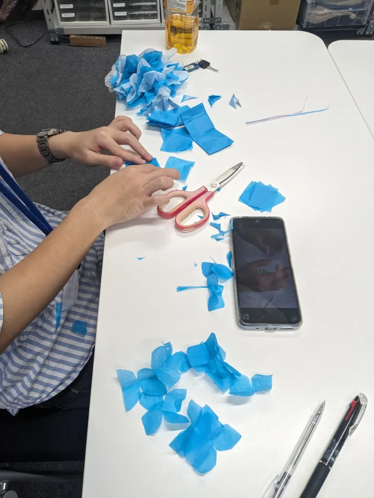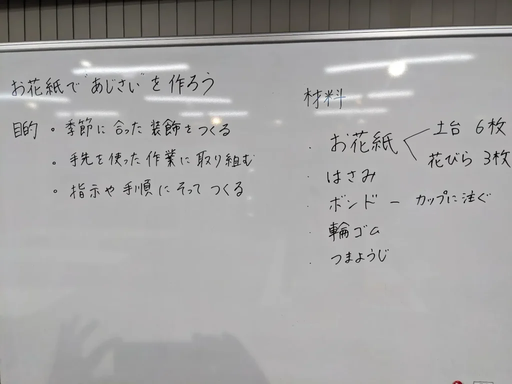今回は季節の作成として、花紙を使ったアジサイの作成をおこないました。
