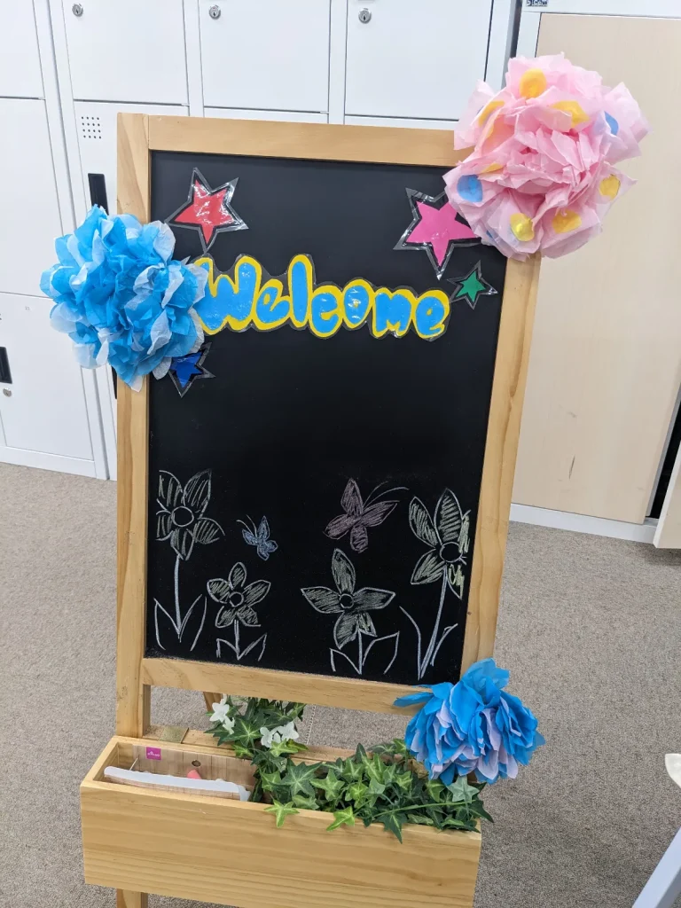 完成したアジサイは来客の方を迎えるウェルカムボードに貼りました!