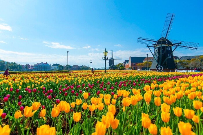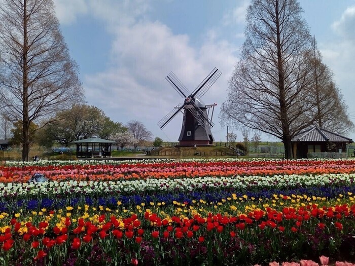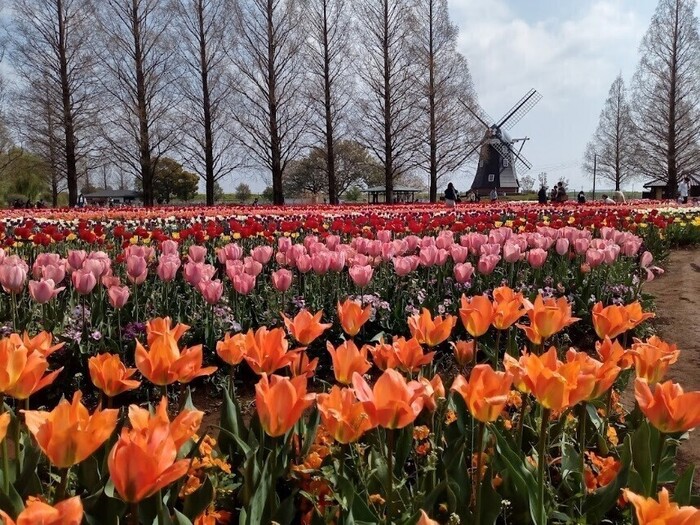 チューリップ畑と風車がコラボレーションしている風景を見るために、