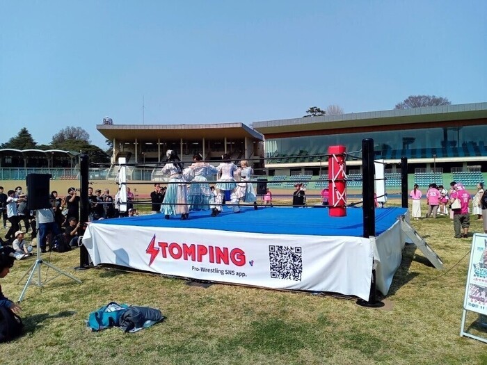 特設リングで開催されている地元アイドルのステージを楽しんでいる方々、