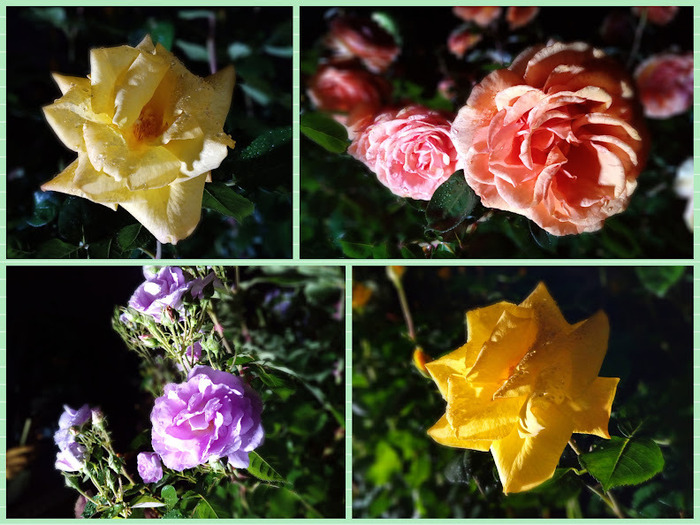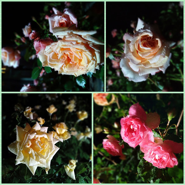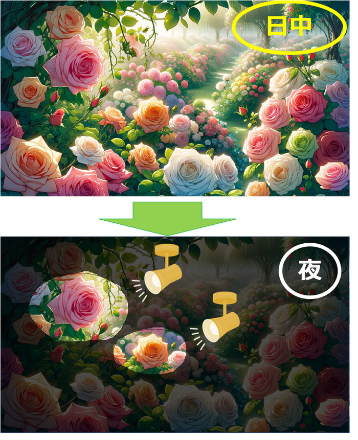 光に照らし出された個々のバラの美しさを楽しむ所のようです。