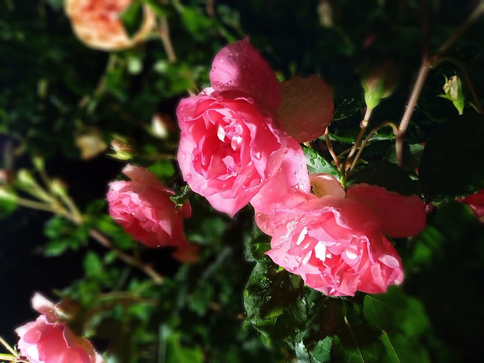 水滴が残った花弁が照らされているバラの花ひとつひとつが