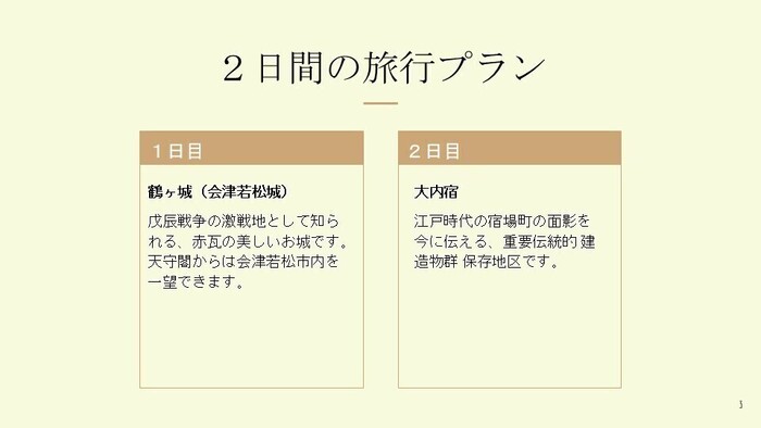 今回の旅行プランですが、2日間で会津を回ることとしました。