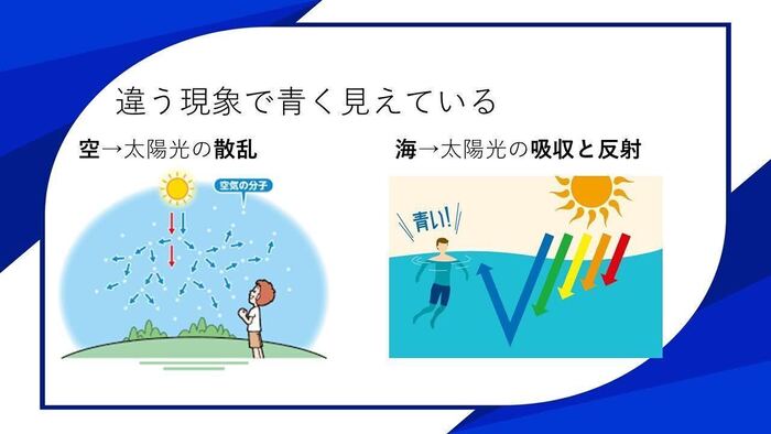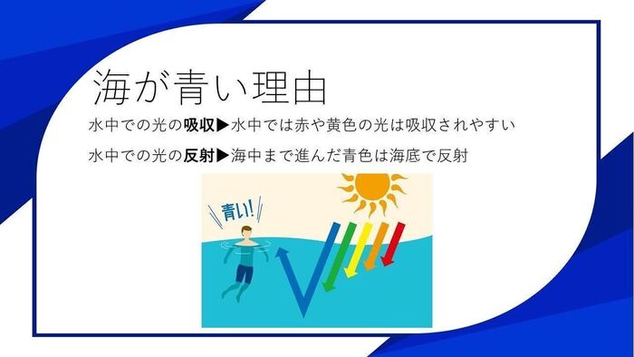 海が青いのは太陽光の吸収・反射 という違った現象によって青く見えることがわかりました。