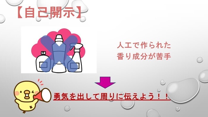 また自己開示として、自分は人工で作られた香りの成分が苦手だということを伝えていこうと思います。