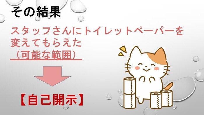 その話をスタッフさんに【自己開示】ということで、お話ししたらトイレットペーパーを無香料のものに変えてくださったのです。