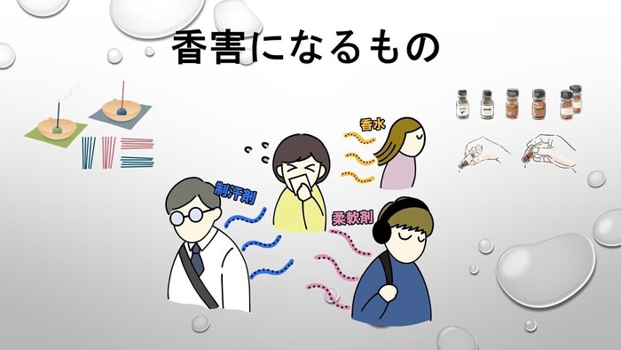 香害の原因になるものには、先に挙げた柔軟剤や合成洗剤、制汗剤、香水、アロマ、お香などがあります。