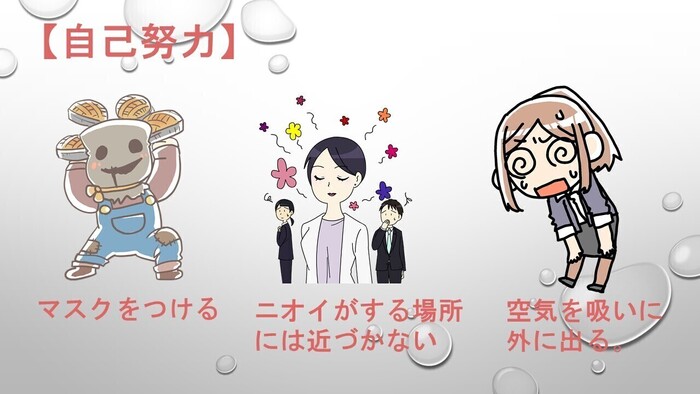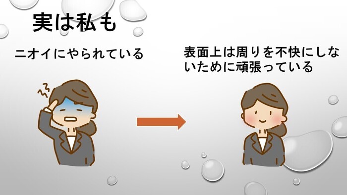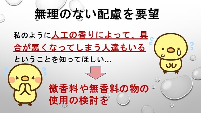 このニオイについては、もちろん好きな人もいらっしゃるので、すべてを変えてくれとはいいませんが、私のような人たちもいるということを知っていただけたらと思います。