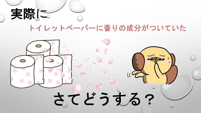 実際にディーキャリアで使用されているトイレットペーパーに香りの成分がついており、トイレに行けなくなってしまいました。さて、この時皆さんだったらどのような行動をしますでしょうか?