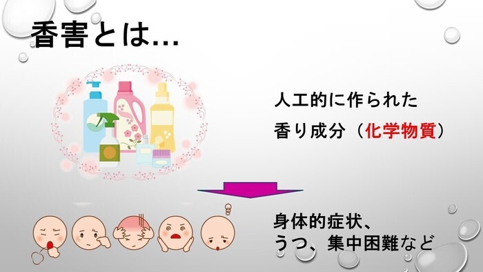 柔軟剤や合成洗剤等の人工的に作られた香り成分、つまり化学物質によって心身に悪い影響が出てしまうことを言います。