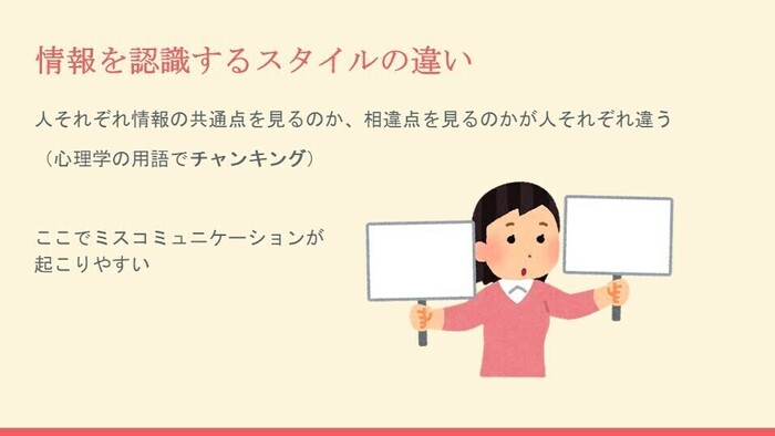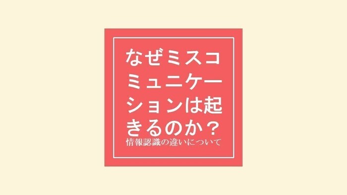 今回は「なぜミスコミュニケーションは起きるのか?」 情報を認識するスタイルが違うから、意思伝達のミスが起きるというお話をしたいと思います。