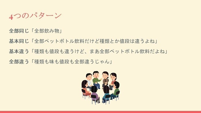 基本同じタイプの人は「全部ペットボトル飲料だけど種類とか値段は違うよね」と、先に共通点を見てから、違いも見ます。