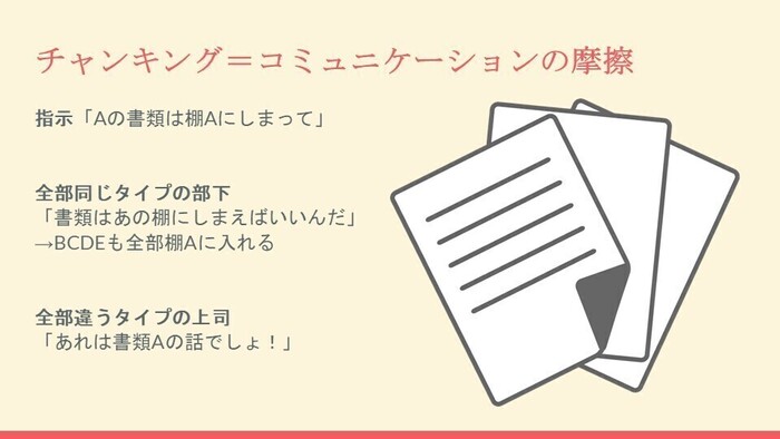 そこで全部同じタイプの部下は「書類はあの棚にしまえばいいんだ」と思って、他の書類BCDEも全部棚Aに入れようとします。 でも全部違うタイプの上司としては、「あれは書類Aの話でしょ!」と怒ってしまうんです。