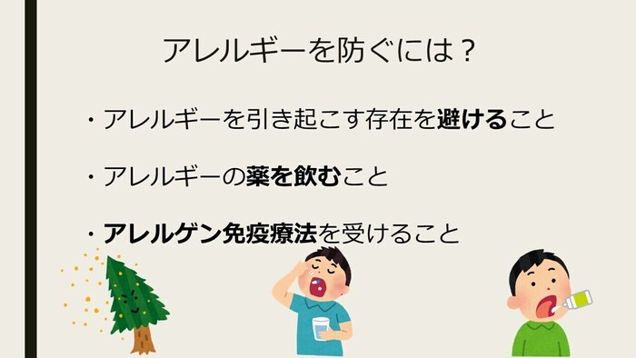 この中でも特に馴染みのないアレルゲン免疫療法について説明いたします。