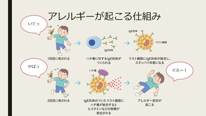 また、アレルギーが起こる仕組みをハチに刺された場合で説明します。